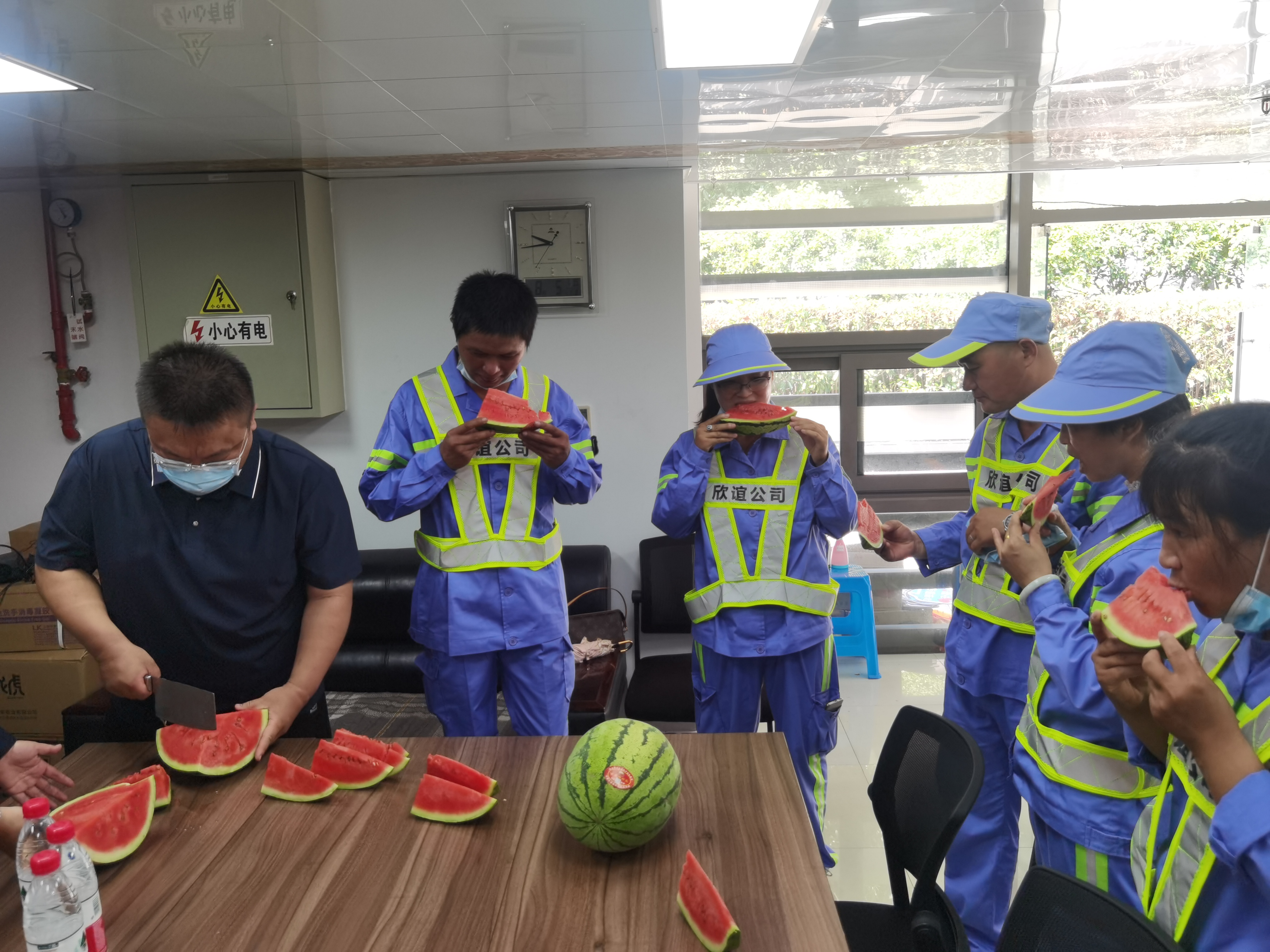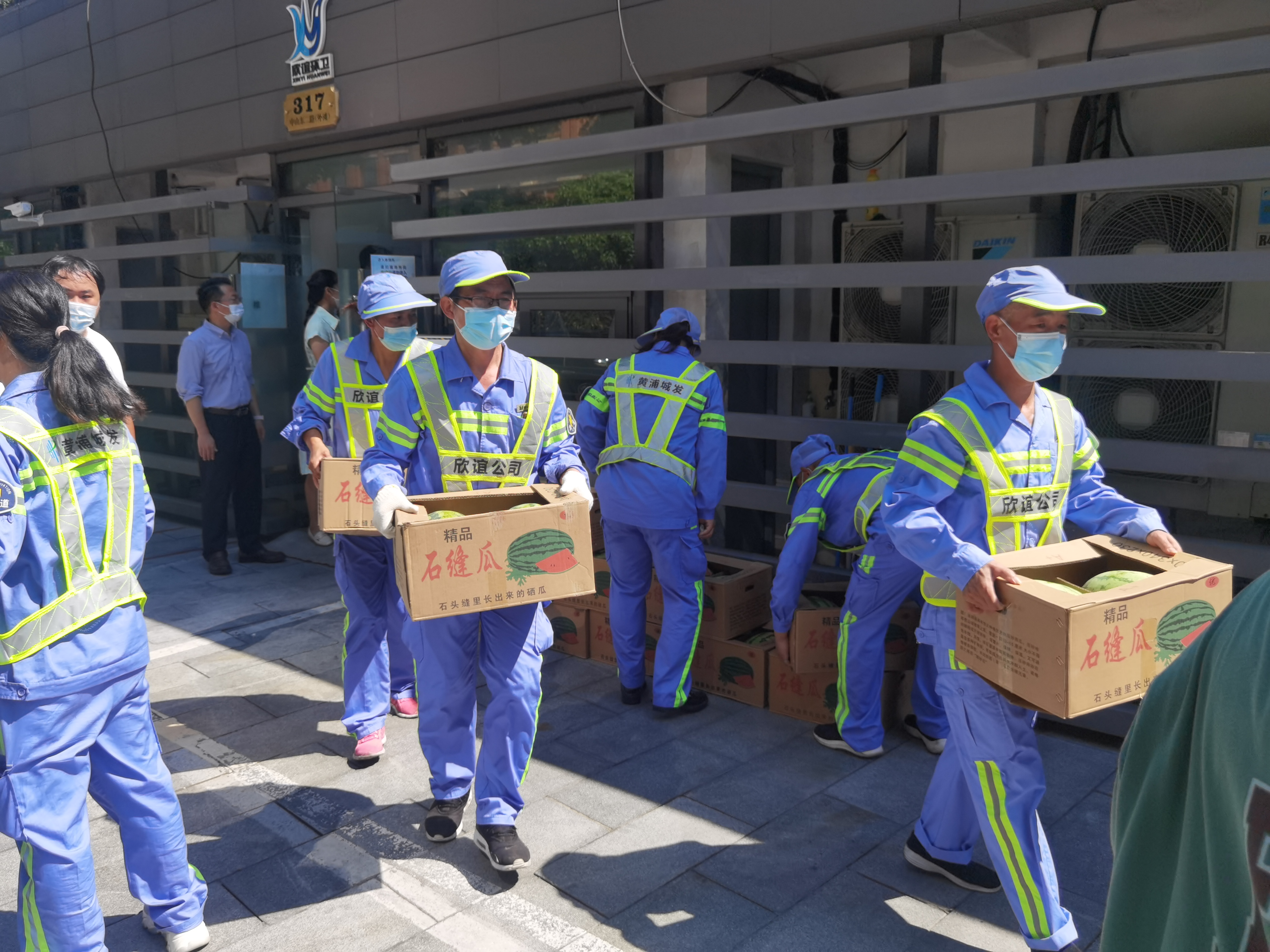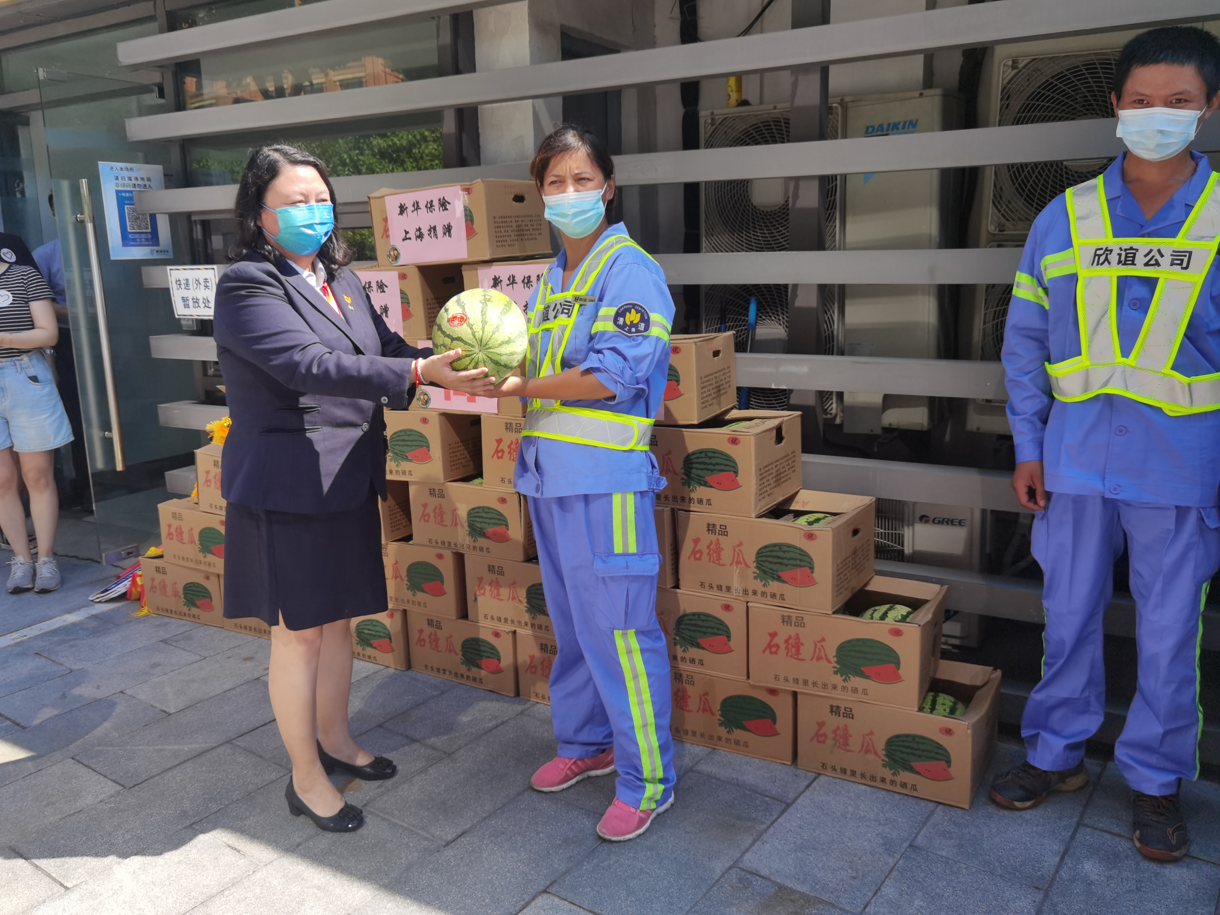 接到中投公司与新华保险总公司的倡议,新华保险上海分公司联合申万宏源证券公司推出“爱心接力西瓜”活动,一方面,帮助甘肃省会宁县农民减少疫情期间西瓜滞销带来的损失,另一方面,传递爱心,将助农砂田瓜作为防暑物资赠与户外劳动的环卫工人。本次活动共为上海市黄浦区约50余名环卫朋友送去了1800多斤西瓜。