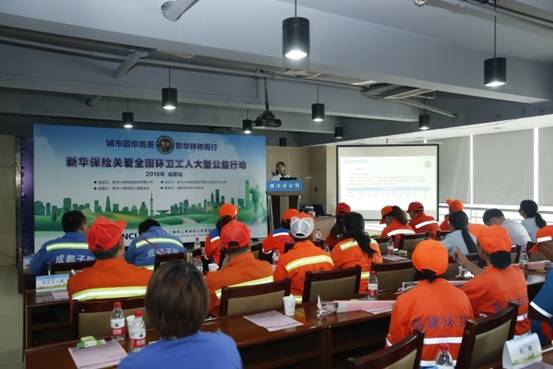 当天的活动不仅是一场捐赠仪式,更是一堂为环卫工人精心准备的专属保险知识讲座。为了今后成都市环卫工人更好的了解和使用这份保障,新华保险四川分公司的保险讲师讲解了“美丽同行——新华保险关爱全国环卫工人专属保险计划”的详细信息,其中包括保险期间、保险责任和理赔流程等。现场的环卫工人们对他们的专属产品都有了深入的了解。